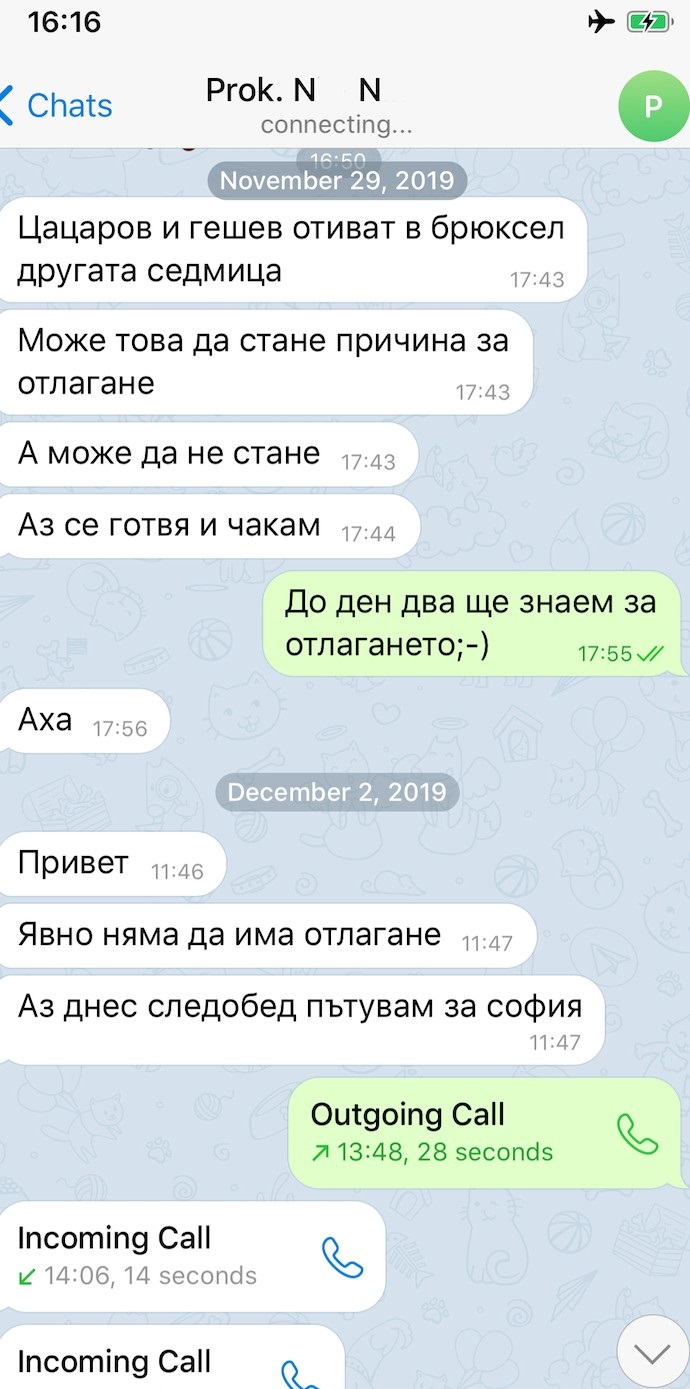 27.12.2018 г. „Prezident-Pl. Uzunov” изпраща поредица от съобщения на обвиняемия със следното съдържание: „Има само проект на решението“, „Първо ще го видиш ти“, „Още не подписано“. В отговор П.Б. пише: Разбрах“. На същия ден в 16.20 ч. обвиняемият получава от „Prezident-Pl. Uzunov” и снимков файл на съдебно решение, придружено с уточняващ текст: „Това е ще е в оригинал“.