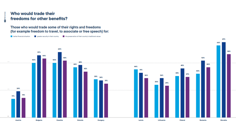 Интересни са и резултатите на въпроса за какво са готови да жертвата правата и свободите си анкетираните в 10-те държави. Словаци и българи изглеждат най-малко привързани към правата си.