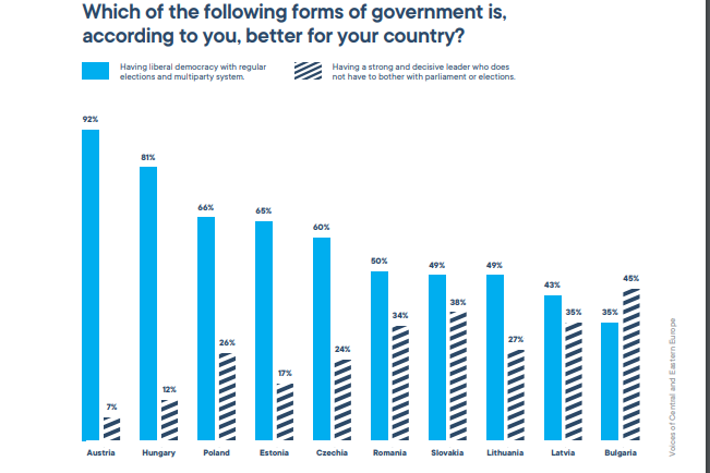 В Австрия е много по-различно съотношението. За управление от т. нар. силна ръка се обявяват едва 7 на сто, срещу 92 на сто, които са за либерална демокрация. В Унгария и Полша, които имат сериозни проблеми със засилващия се авторитаризъм на управлението си, както и с постоянните атаки срещу либералната демокрация, поддръжниците ѝ остават стабилно мнозинство - 81 на сто и 66 на сто съответно. За силен лидер се обявяват 20 на сто и 26 на сто от анкетираните - съответно в Унгария и в Полша.