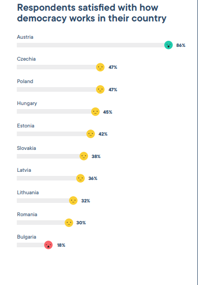 Според данните от изследването най-доволни от начина, по който функционира демокрацията в тяхната страна са австрийците - цели 86 на сто от тях. На последното място с едва 18 на сто са българите.