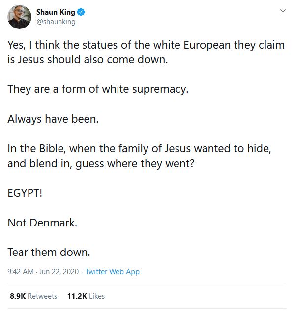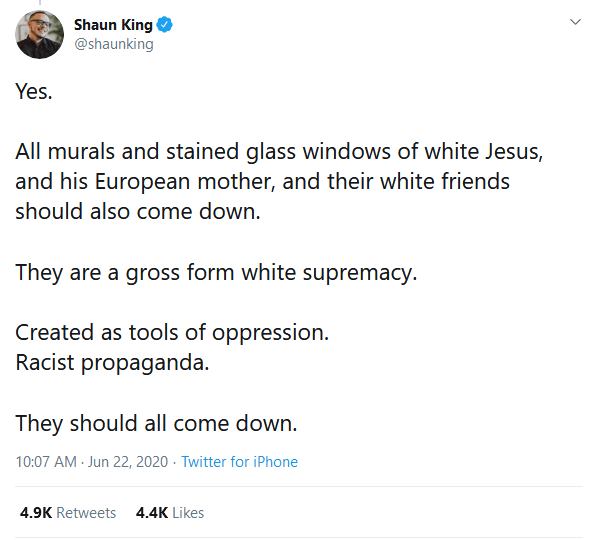 "Tear them down!", така пише един екстремист за статуите на Христос и Света Богородица", където са изобразени като бели европейци. Тази дума означава да ги свалят или да ги разрушат. Той не говори за една или друга статуя, а за всички. В друго изявление иска да бъдат унищожени и стъклописите, където Божият син е изобразен като човек от бялата раса. Отново...не говори за конкретен стъклопис, а за всички.