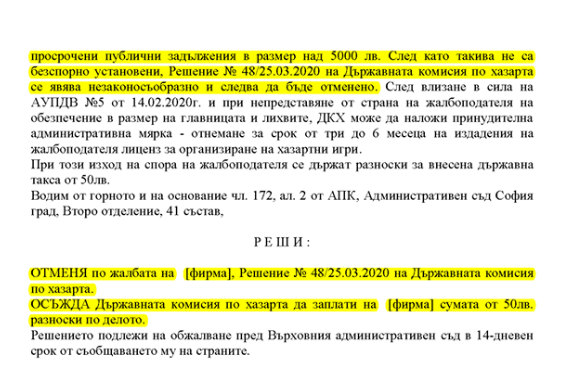 Според решението на съда няма влязъл в сила акт за установяване на публично държавно вземане и просрочените публични задължения не могат да бъдат основание за временно отнемане на лиценз за организиране на хазартни игри.