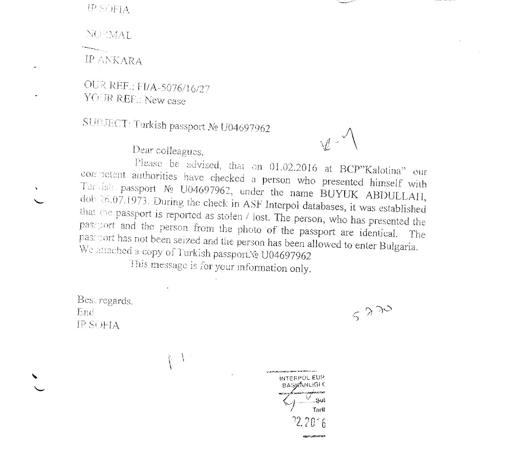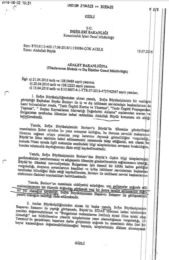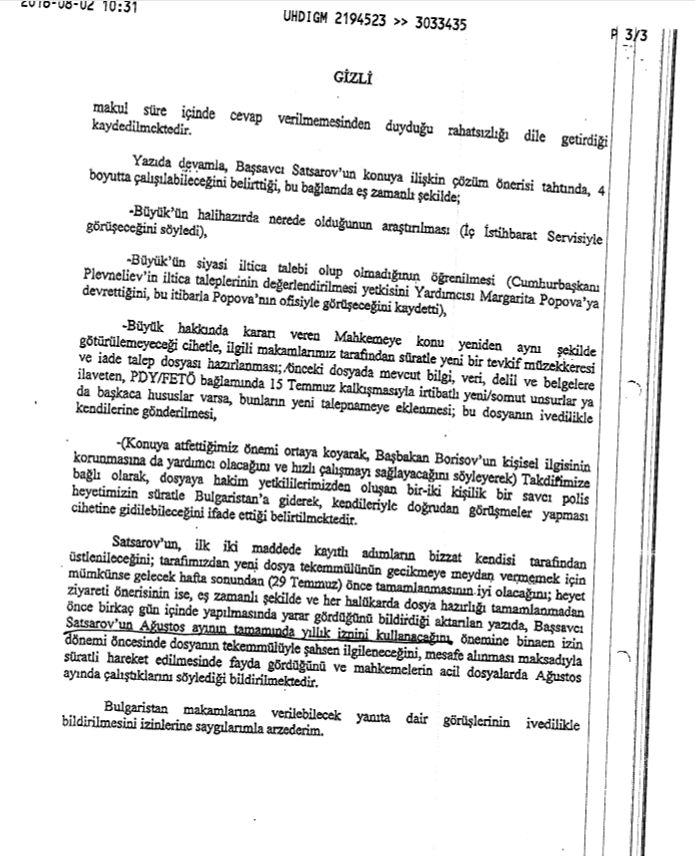 „В писмото (получено от турското посолство в България – бел. авт.) се посочва, че посланикът ни в София е поискал от г-н Борисов незабавно да се отговори на исканата информация, отнасяща се за Бююк и да се организира връщането на споменатия в нашата държава. Посланикът е подчертал, че присъствието на Бююк в България се превръща в голяма тежест за нея, че подробностите по делото са известни, както на него самия, така и на ръководителите на вътрешното/външното разузнаване, и че г-н Борисов и ръководители на разузнаването са потвърдили въпросните твърдения.“