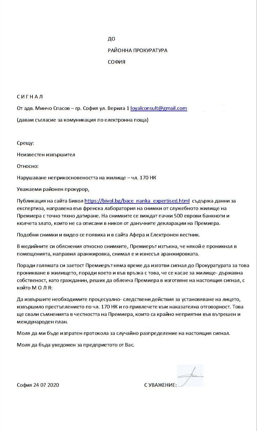 "Поради голямата си заетост премиерът няма време да изготви сигнал до прокуратурата за това проникване в жилището, поради което и във връзка с това, че се касае за жилище - държавна собственост, като гражданин реших да облекча премиера в изготвяне на настоящия сигнал, с който моля да извършите необходимите процесуално-следствени действия за установяване на лицето, извършило престъплението по член 170 от Наказателния кодекс и го привлечете към наказателна отговорност."