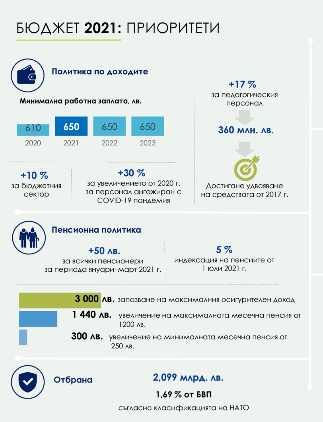 Политиката в областта на отбраната - осигурени са средства за поддържане и развитие на националните отбранителни способности и способностите, свързани с колективната отбрана, в т.ч. средства за изпълнение на одобрените от Народното събрание инвестиционни проекти за модернизация на Българската армия, а именно: придобиването на многофункционален модулен патрулен кораб за ВМС и основна бойна техника за изграждане на батальонни бойни групи от състава на механизирана бригада. Допълнително са предвидени средства за изграждане на интегрирана система и инфраструктура за усвояване, експлоатация и осигуряване на новия тип боен самолет. За 2021 г. разходите за отбрана възлизат на 1,69 на сто от БВП, което е с 0,05 % от БВП повече от референтния процент на разходите към БВП по Националния план за повишаване на разходите за отбрана на 2 на сто от БВП на Република България до 2024 година.