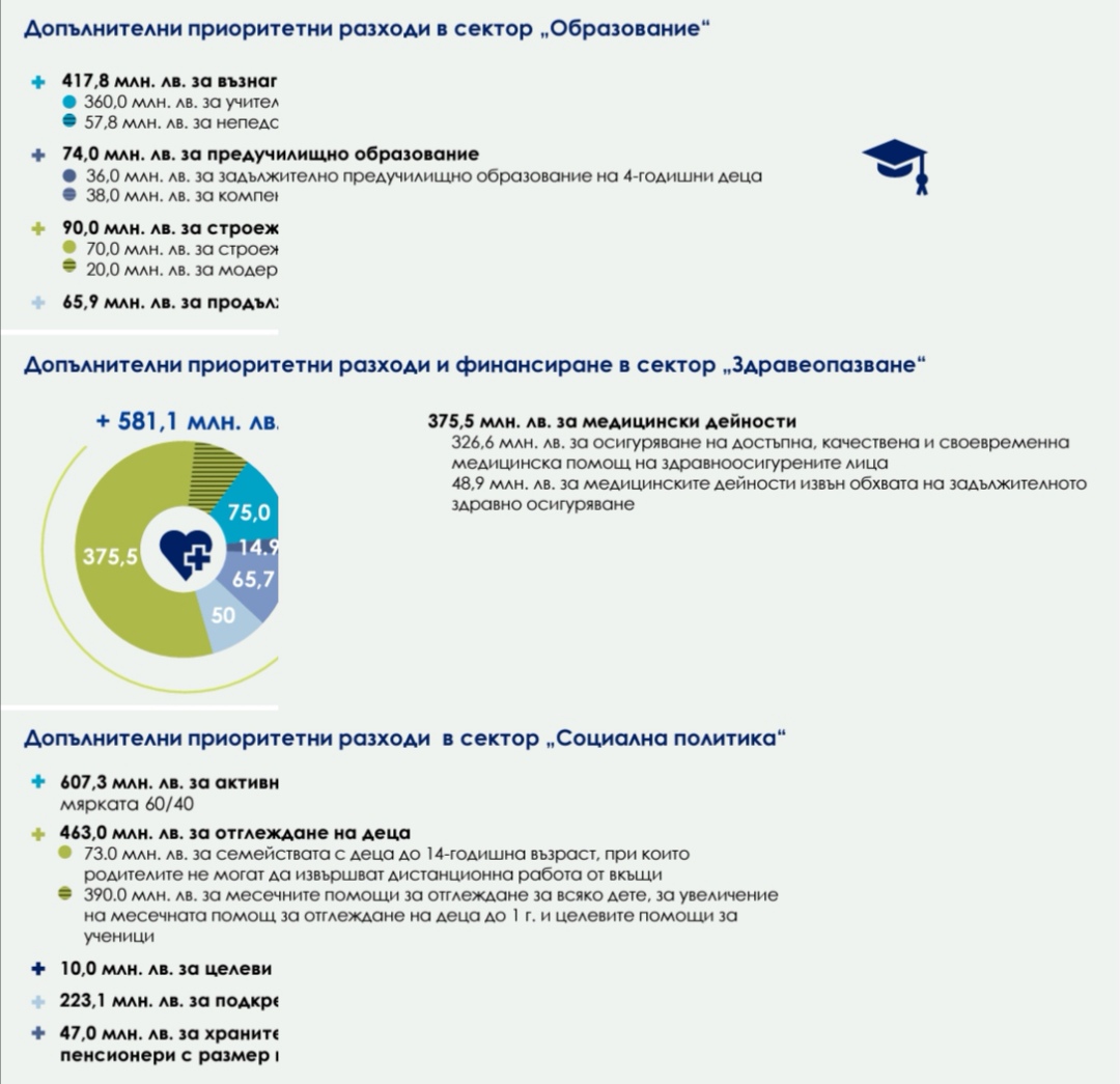 В конкретика - обещаното увеличение на минималната работна заплата от 1 януари на 2021 г. до 650 лв. ще се състои, но следващите две години тази точка ще бъде замразена. Ще се удвоят възнагражденията на педагогическите специалисти, ще има увеличение и за непедагогическия персонал в училища и детски градини.