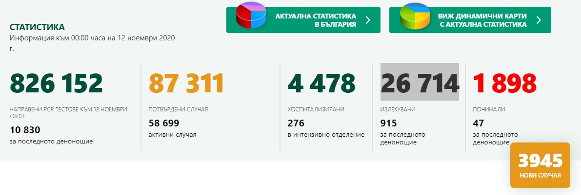 3945 нови случая на коронавирус у нас са регистрирани за изминалото денонощие. Това показват данните в Единния иформационен портал.