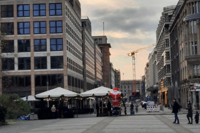 В други години по това време под купола има ледена пързалка с шоу, заведенията са препълнени и трудно може да се намери свободна маса, а киното е препълнено със семейства, дошли за любима коледна премиера. Сега всички заведения са тъмни, а киното вече фалира и няма да отвори наново и след пандемията. Работи само една книжарница и кафенето до нея, в което кафето се продава само за навън. За на крак се продава и греяното вино тази година – вместо коледни базари по улиците тук-там има малки щандове, които предлагат традиционната напитка.