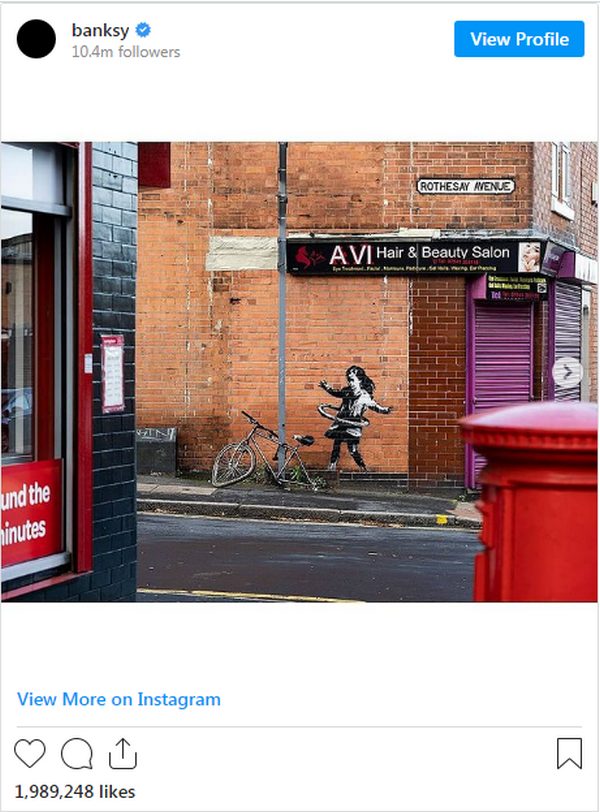 Спекулации съпътстват творбата още от появата ѝ в Нотингам, Великобритания, на 13 октомври, докато анонимният артист не потвърди в профила си в инстаграм, че изображението е негово дело. Графитът бързо се превърна в една от забележителностите на града и мнозина искаха да го видят на живо.