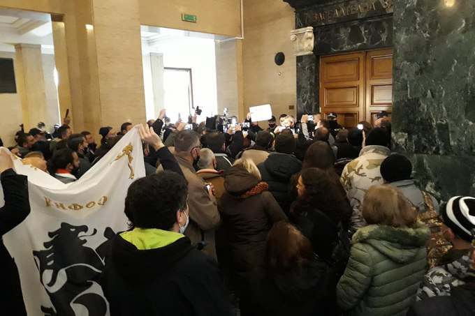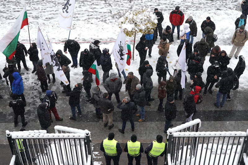 Въпреки лошото време и снеговалежа в София над 80 души се струпаха пред Съдебната палата от сутринта с трибагреници, знамена и лозунги, ранички, ленти, маски и всякакъв мърчандайз на "Възраждане", за да подкрепят лидера си.
