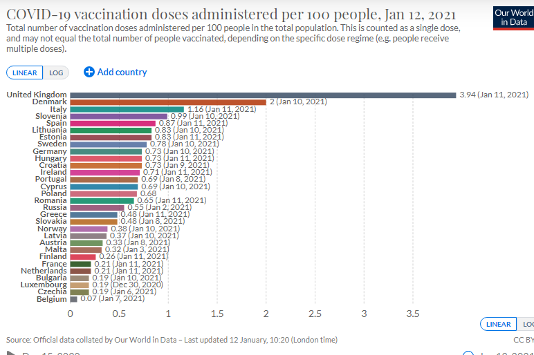 Данните на Our World in Data (тук са и източниците за статистиката за отделните държави) сочат, че Дания излиза начело в класацията за държавите членки с най-голям брой дози от ваксина срещу COVID-19, приложена на 100 души от населението на страната. (Необходимо е уточнението, че двете ваксини, одобрени към момента от ЕС, се прилагат на две дози, т.е. това не е реалния брой окончателно ваксинирани.)