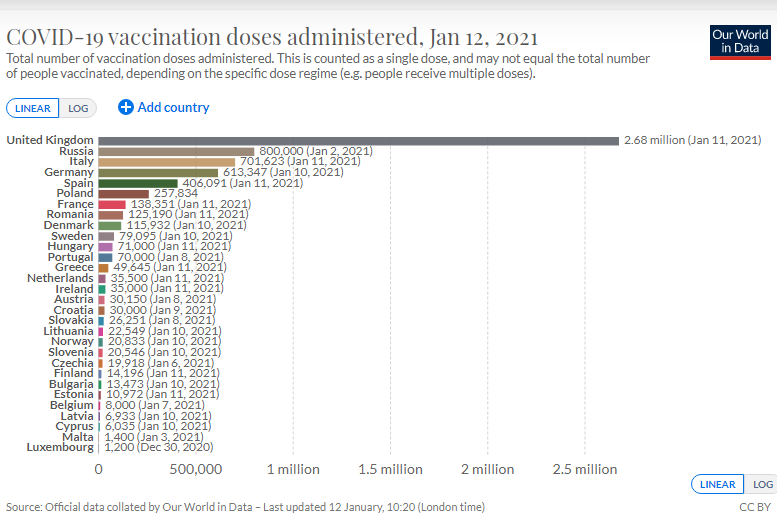 Втората графика представя приложените в абсолютни стойности досега дози. Към 11 януари във Великобритания са инжектирани 2,68 млн. дози от ваксини срещу COVID-19.