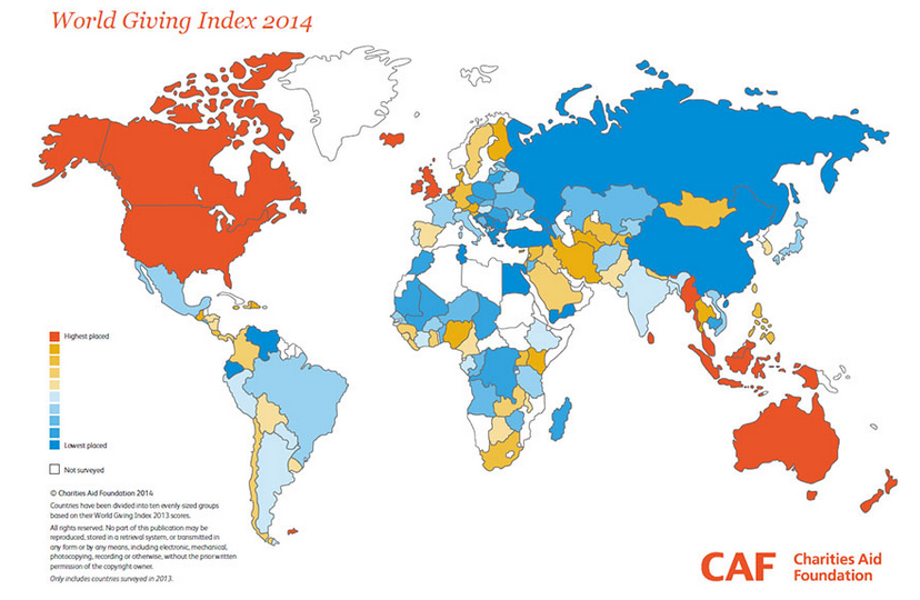 Първи в класацията са две твърде различни дължави - САЩ и Мианмар с по 64%. . Докато САЩ присъстват и в трите подкатегории в челната десетка, силата на Мианмар е в даряването на пари. 91 на сто от анкетираните са казали, че даряват пари. Обяснението се търси във факта, че това е много важен момент за будистката традиция на Тхеравада, която е основополагащата религия в страната. Там много силен е институтът на будистките монаси, които оцеляват чрез даряване от хората, т. нар. дана. Друга страна със силен Тхеравада будизъм - Шри Ланка - също намира място в челната десетка на класацията.