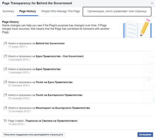 Групата Behind the Government също е анонимна. В информацията за нея не са посочени администратори и постовете не се правят от името на лични профили. Тя има 7-годишна история, като за този период е била преименувана цели 6 пъти. Групата е създадена през юли 2013 г., вероятно по време на антиправителствените протести срещу Пламен Орешарски, под името „Подписка за Сваляне на Правителството“. През октомври 2015 г., по време на второто правителство на Бойко Борисов, името се променя на „Мониторинг на Българското Правителство“. След това в рамките на два месеца страницата се преименува още четири пъти до април 2017 г., когато тя вече се нарича Behind the Government. През годините съдържанието, публикувано на страницата, е разнородно, но общият знаменател е изобилието от непроверени, недостоверни или откровено фалшиви новини. От началото на пандемията администраторите публикуват съдържание ежедневно, като много от постовете засягат ваксините срещу COVID-19. Част от публикациите са определени от алгоритъма на фейсбук като фалшиви новини.