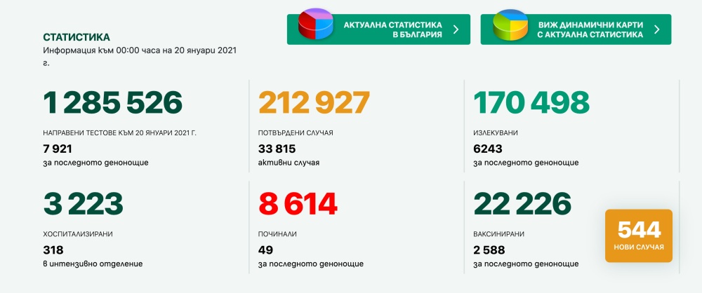 544 е броят на регистрираните нови случаи на коронавирус в България, показват данните на Единния информационен портал към 20 януари. Направените тестове (PCR и бързи за антитела) са 7921 (съответно 4071 и 3850, общо 1 285 526 от началото на пандемията).