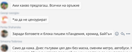 Всички тези хора вече са част не само от една фейсбук група, където се чувстват сред свои съмишленици със сходни интереси. Пренасянето на тази микрообщност и на друго място, а оттам и в срещи лице в лице, превръща социалната мрежа в инструмент за постигане на външни цели. Борбата с мерките на правителството срещу коронавируса е темата днес. Вълната от дезинформация по-рано е била насочена в друга посока и крайната цел отново е била противопоставяне на държавни инициативи.