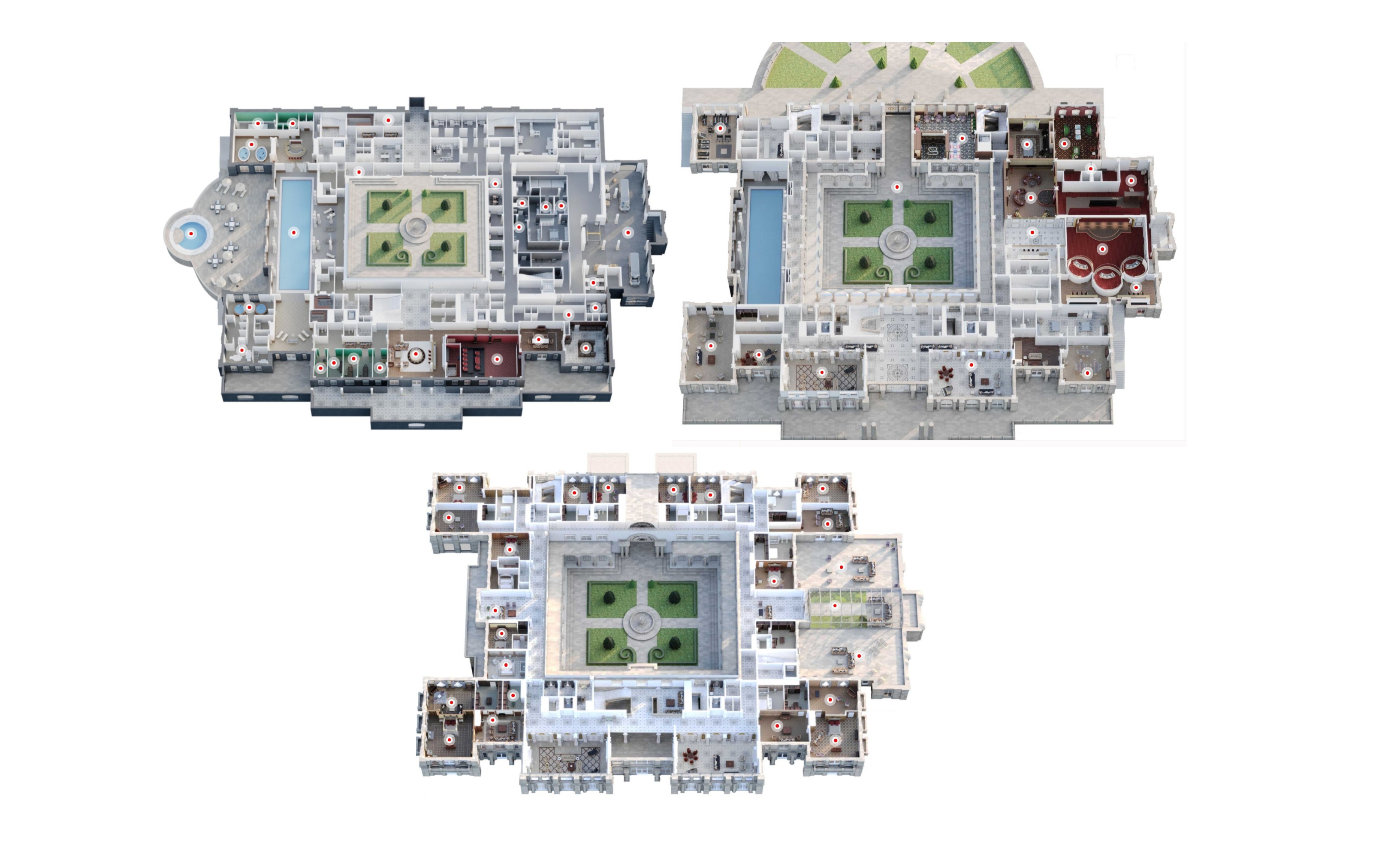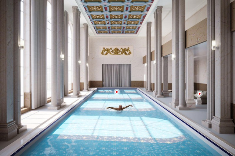 На приземния етаж са разположени спа зона, масажорна, козметичен кабинет, спа капсула, фризьорски салон... А за водните процедури има огромен басейн, сауни, хамами и джакузита.