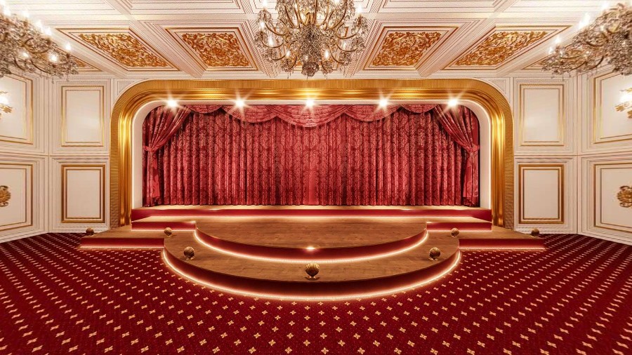 Читалня в бяло и киносалон в червено. И не просто киносалон, а истински театър.