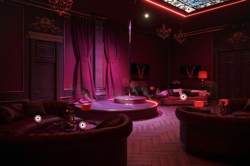Като излезеш от него, попадаш във фоайе с бар. А вдясно - врата и едно озадачаващо помещение в двореца на Путин. Няма нито един прозорец, затова пък има сцена, гримьорна, а и нещо, което много прилича на пилон... В плана е наречено "пушалня за наргилета".
