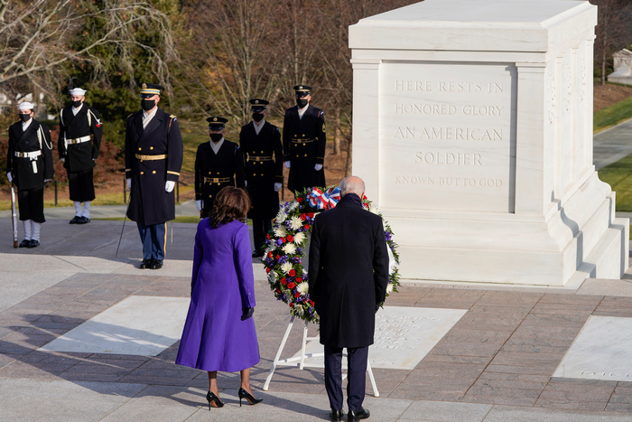 По-късно Байдън прие парад на военни части пред Капитолия, положи венец във военното гробище в Арлингтън, Вирджиния, в присъствието на тримата бивши президенти, а по-късно кортежът му се отправи към Белия дом, където той трябваше да подпише първите си актове и заедно с Харис да участва в телевизионна програма под заглавие "Честваме Америка" с водещ кинозвездата Том Ханкс.