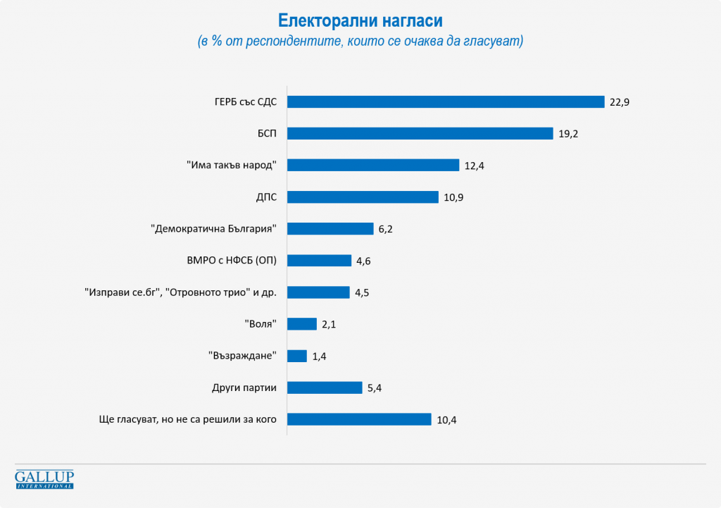 С 22,9% от онези, за които може да се очаква да гласуват, ГЕРБ и СДС са на първо място, следвани от БСП с 19,2%.