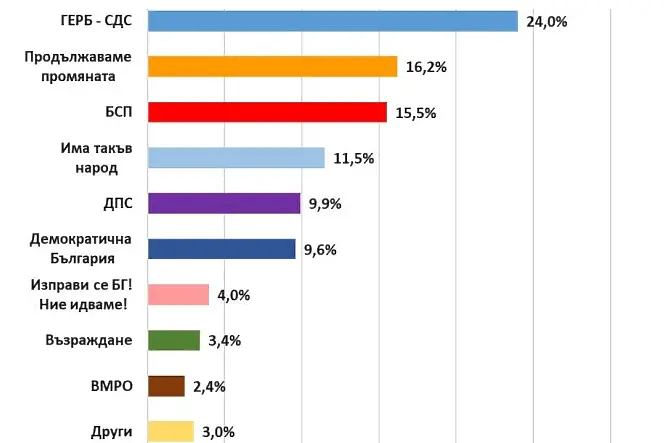Пет дни преди вота за парламент, ГЕРБ запазва позицията си на първа политическа сила с 24 на сто от гласовете на твърдо решилите да гласуват и избралите кого да подкрепят. Електоралната подкрепа за "Продължаваме промяната" е 16,2 процента, а тази за БСП - 15,5 на сто