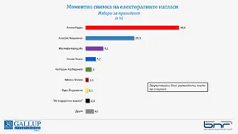 Ако изборите бяха в края на първата десетдневка на ноември, ГЕРБ би получила 23,5% от вота, „Продължаваме промяната“ и БСП са с равни изгледи, съответно с 15,5% и 15,2%. „Има такъв народ“ се ползва с 11,4% електорална готовност. ДПС – 11,3%, „Демократична България“ – 9,6%. 3,5% от възнамеряващите да гласуват посочват „Възраждане“, 3,4% – „Изправи се, България! Ние идваме“, ВМРО – 2,1%. 4,5% ще предпочетат други опции, отчитат от "Галъп".