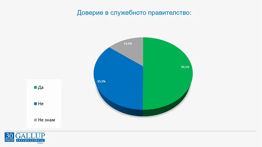 На изричен въпрос за доверие в служебния кабинет, 50,1% от пълнолетните българи отговарят утвърдително. Малко над една трета са отрицателните отговори, а 14,4% не могат да преценят. Така, правителството "Янев" завършва управлението си си с положителен баланс доверие/недоверие – което е сравнително рядко срещано при българските институции, подчертават от агенцията.