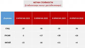 Международните политики на Русия и Китай се приемат като по-скоро дестабилизиращи за света и в това отношение глобалните нагласи не са се променили в сравнение с последните няколко години.