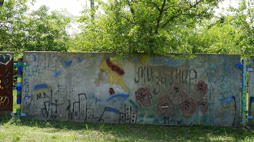 Такъв е и случаят в Преображенка, досами фронтовата линия (при посещението на автора селото все още е зад украинските позиции - бел. ред.). Мястото е административен център на местната хромада (локална териториална единица, включваща обединени на доброволен принцип общности - бел. ред.), състояща се от 15 села. На площада има голямо, красиво и наскоро ремонтирано училище с обширен двор с брези. На една от стените срещу него през 2017 г. учениците са изрисували с графити своето послание: „Ние сме за мир“.