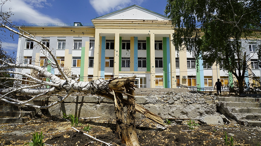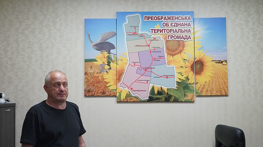 „Училището беше поразено на 1 юни“, делово заявява Володимир Сидун, кмет на Преображенка, който тихо се е появил зад нас, идвайки от бомбардираната сграда на кметството на петдесетина метра.