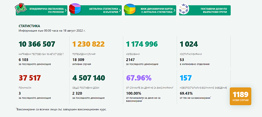 1189 са новите случаи на коронавирус у нас при направени 6103 теста, показват данните в Единния информационен портал. Положителни са над 19% от взетите проби.