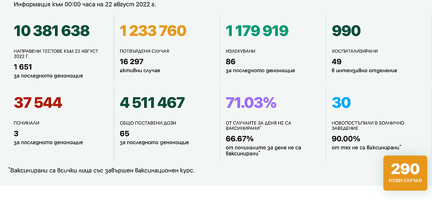 290 са новите потвърдени случаи на COVID-19 в България, регистрирани през последните 24 часа, информира Единният информационен портал.