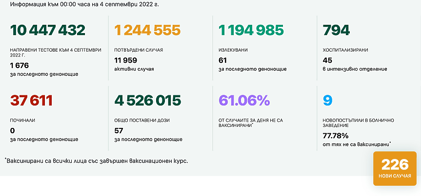 Новите потвърдени случаи на коронавирус в България за последното денонощие са 226, сочат данните на Единния информационен портал.