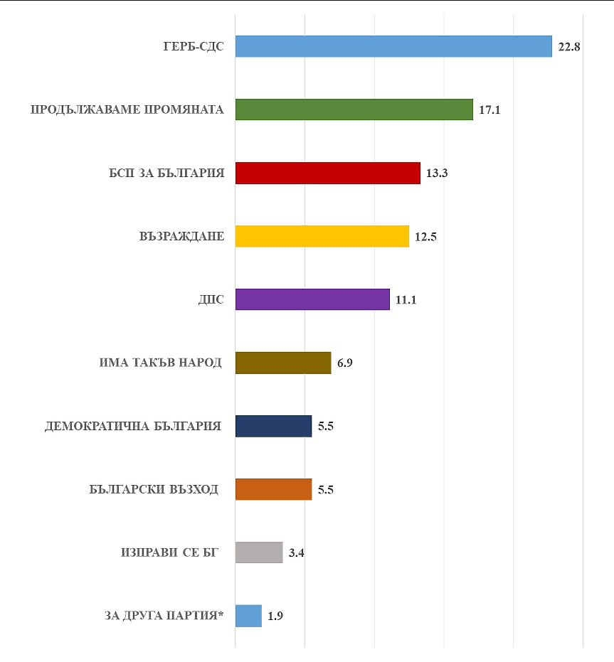 Засега ГЕРБ (22,8 на сто) доминира, като води с близо 6 % пред "Продължаваме промяната" (17,1%).