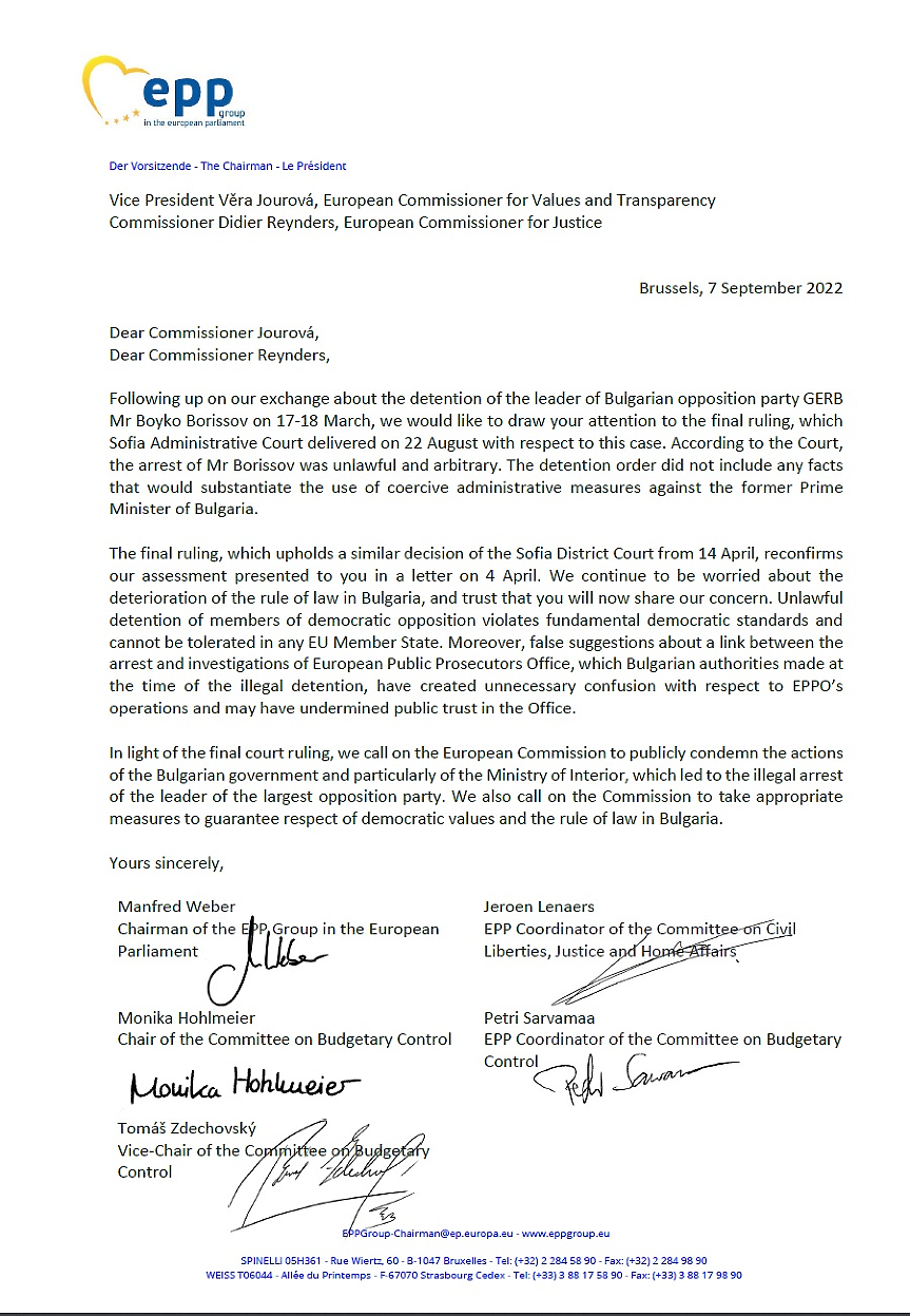 Европейската комисия публично да осъди действията на българското правителство с премиер Кирил Петков и вътрешното министерство по повод незаконния арест на лидера на най-голямата опозиционна партия Бойко Борисов. За това настояват от Европейската народна партия (ЕНП) в специално писмо до зам.-председателя на Европейската комисия (ЕК) и комисар по ценностите и прозрачността Вера Йоурова и еврокомисаря за правосъдието Дидие Рейндерс.