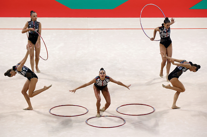 Българският ансамбъл спечели титлата в многобоя и олимпийска квота за "Париж 2024" на Световното първенство по художествена гимнастика в столичната зала "Арена Армеец".
