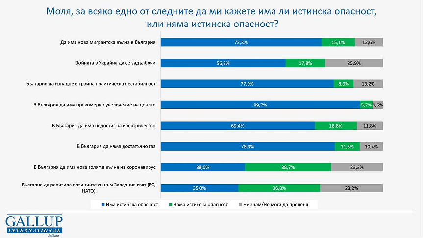 Близо 90% намират за реална опасността увеличението на цените у нас да стане прекомерно. Тук обществото е на практика единодушно. Опасности като потенциален недостиг на газ и съответно отопление се намират за реални от близо 80% от българите.