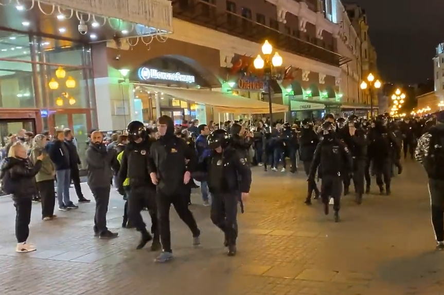 Stary Arbat in central Moscow right now. A few hundred people mostly just standing around. Isolated chants of “No to war!” Police randomly picking people up, pretty roughly pic.twitter.com/XptsrcRzoG