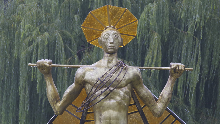 Днес композицията тежи над 2 тона – изработена е от неръждаема стомана, стъкло и отлети от месинг фигури.