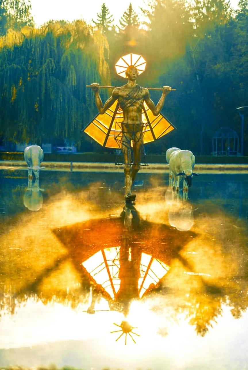 "Водна паша" представлява пастир с оранжево наметало, който води своите овце във водното огледало при входа на столичния Южен парк откъм бул. "Петко Ю. Тодоров".
