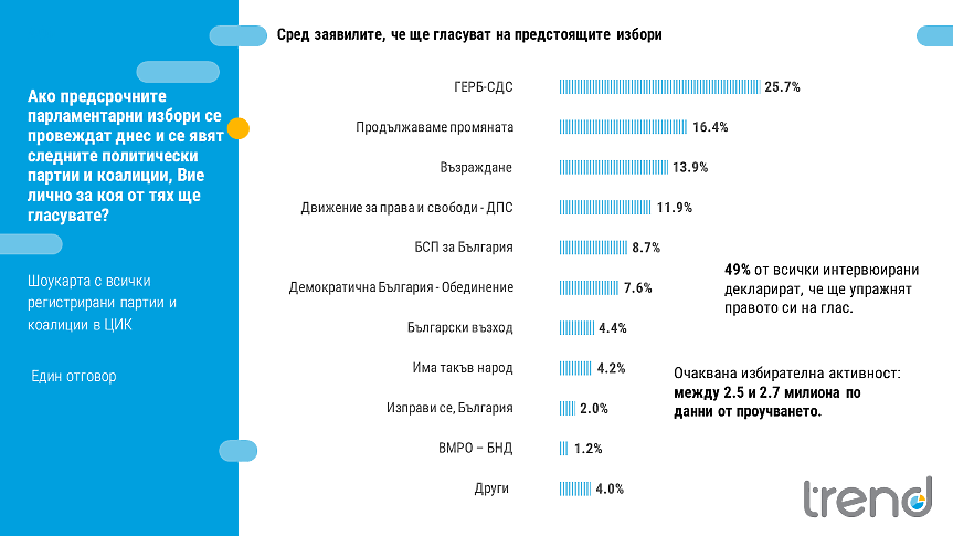 Това показват данните от последното преди 2 октомври изследване на "Тренд". Проучването по поръчка на вестник „24 часа" е посветено на електоралните нагласи на българите преди предсрочните парламентарни избори. Изследването е реализирано в периода между 21 и 27 септември 2022 г. чрез пряко полустандартизирано интервю "лице в лице" с таблет сред 1001 души на възраст 18+.