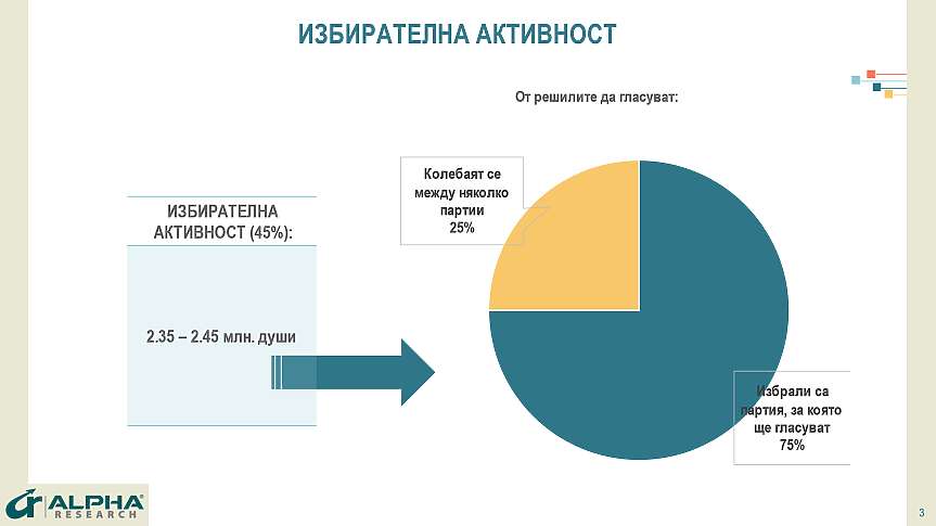 Относително ниска избирателна активност – в рамките на около 45% от пълнолетното население в страната. Очакванията са до урните да отидат не повече гласоподаватели, отколкото през ноември миналата година, която отбеляза рекорд по нисък вот, а е напълно възможно активността да се слезе и под прага от 2 милиона и 600 хил. гласуващи. Кампанията не е повишила съществено нито желанието за участие в изборите, нито категоричният избор на българите, е изводът на социолозите.