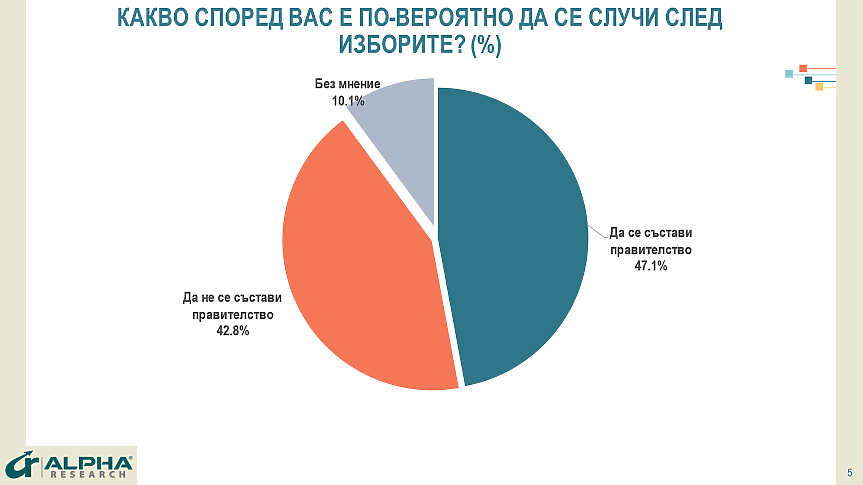 Три дни преди предсрочните парламентарни избори, българите остават поляризирани и твърде скептични към възможността след тях да се сформира редовно правителство. 47,1% смятат, че ще се състави кабинет. 42,8% не смятат за реалистична тази възможност. Огромното мнозинство от българите желаят съставянето на кабинет, но очевидно позициите и поведението на партиите в предизборната кампания излъчват противоположни послания. Което, освен всичко друго, демотивира не малка част от гражданите да отидат до урните.