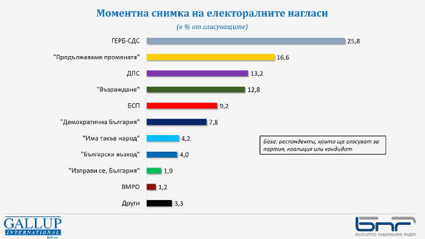 Ако изборите бяха в последната десетдневка на септември, ГЕРБ-СДС взема 25,8% от потенциалните гласове за партии, коалиции или независими кандидати, "Продължаваме промяната" - 16,6%, а ДПС и "Възраждане" към края на септември спорят за третото място, съответно с 13,2% и 12,8%.
