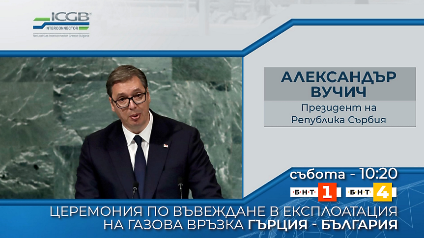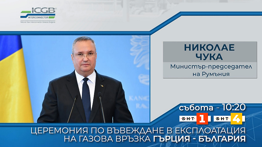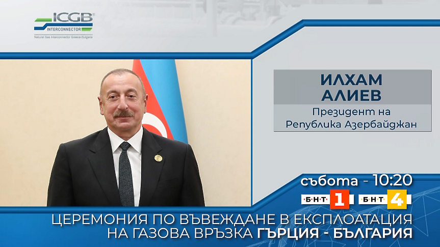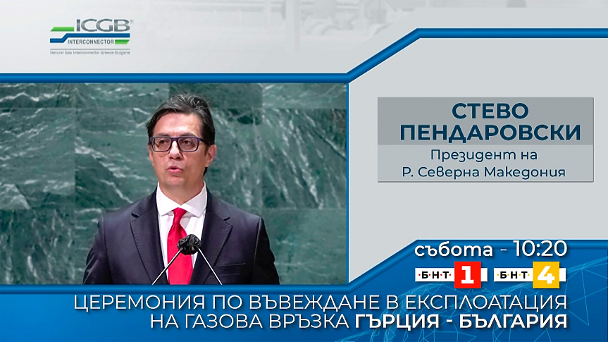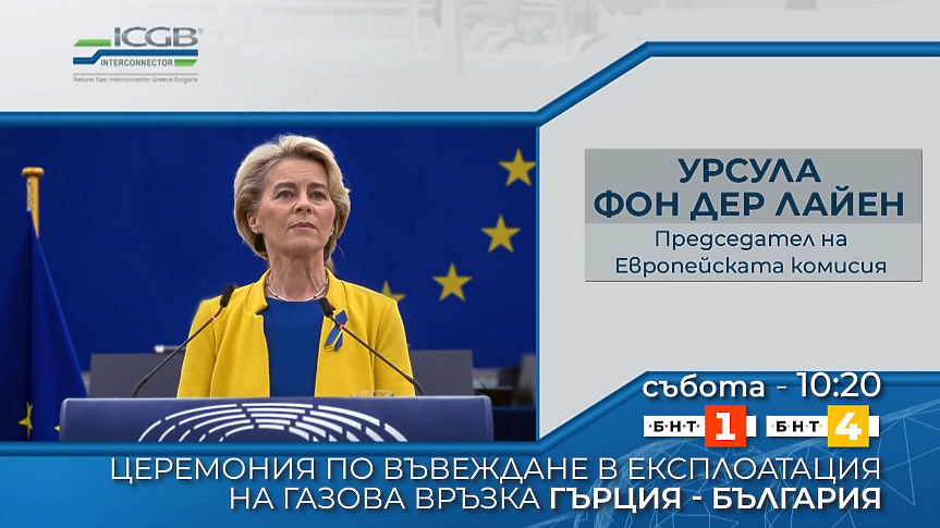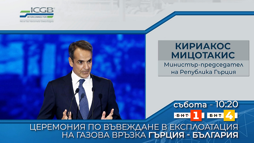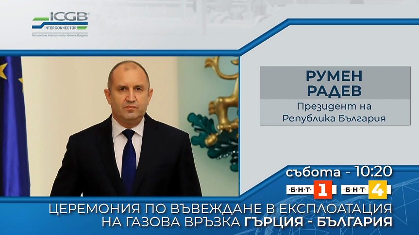 На 1 октомври, събота, Българската национална телевизия ще излъчи на живо от Националния дворец на културата официалната церемония по въвеждане в търговска експлоатация на интерконектора Гърция – България. Специалното студио с водещ Георги Любенов започва в 10:20 ч. в ефира на БНТ 1 и БНТ 4.