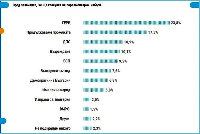 ГЕРБ (23,8%) запазва лидерската позиция, а дистанцията им с „Продължаваме промяната“ (17,5%) се увеличава, поради продължаваща ерозия в подкрепата спрямо основната управляваща формация.