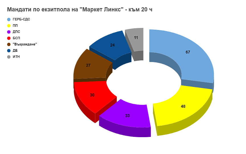 Към момента изглежда, че в парламента влизат седем партии - и ИТН прескача 4-процентната бариера, съдбата на "Български възход", единственият нов играч на този вот, е на ръба.