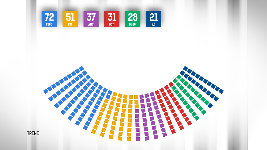 ГЕРБ е първа политическа сила. С разлика от около 6-7 процента я следва "Продължаваме промяната". Третата позиция е за ДПС. Четвърта е БСП. След нея е "Възраждане", чийто лидер Костадин Костадинов до последно упорстваше, че партията ще е №1 на тези избори. Шеста е "Демократична България".
