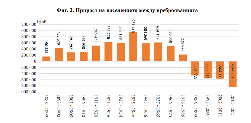 Заради отрицателния естествен прираст българите в страната са станали с 501 хил. по-малко, или това са 59,3% от общото намаление. Естественият прираст за всички години от периода между преброяванията през 2011 и 2021 г. е отрицателен, като най-голямо е намалението на броя на населението през 2021 (годината на COVID, в която имаше рязък скок на смъртността - бел. ред.) година (-90 317 души).